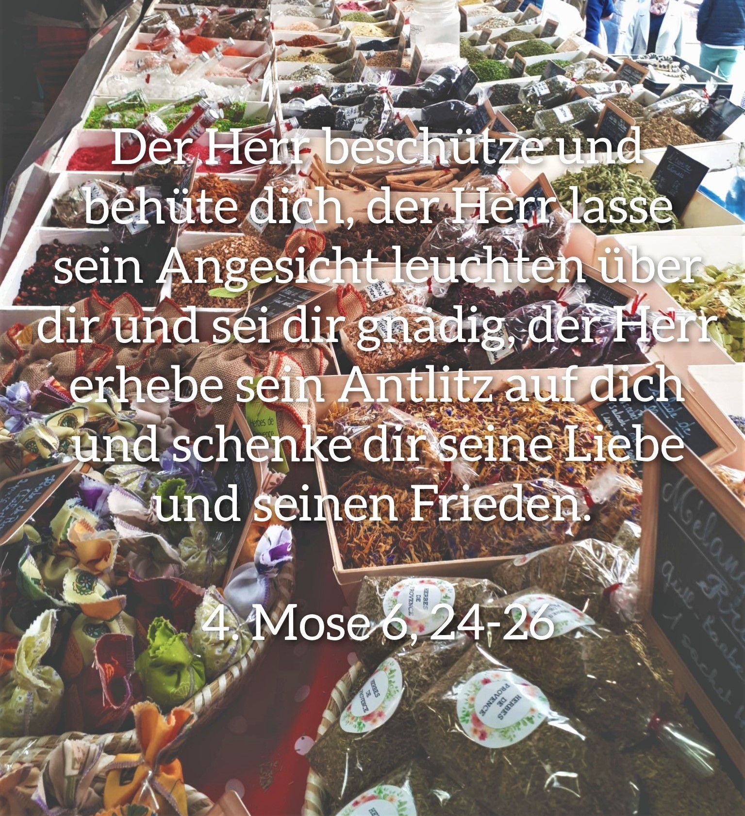 Auf dem Bild ist ein bunter Verkaufsstand mit vielen Gewürzen, Nüssen und Trockenfrüchten. Folgender Text ist zu lesen: Der Herr beschütze dich und behüte dich, der Herr lasse sein Angesicht leuchten über dir und sei dir gnädig, der Herr erhebe sein Antlitz auf dich und schenke dir seine Liebe und seinen Frieden. Aus dem 4. Buch Mose 6 Verse 24-26 Bildrechte bei Berit Busch, Collage von Liana Gawlik